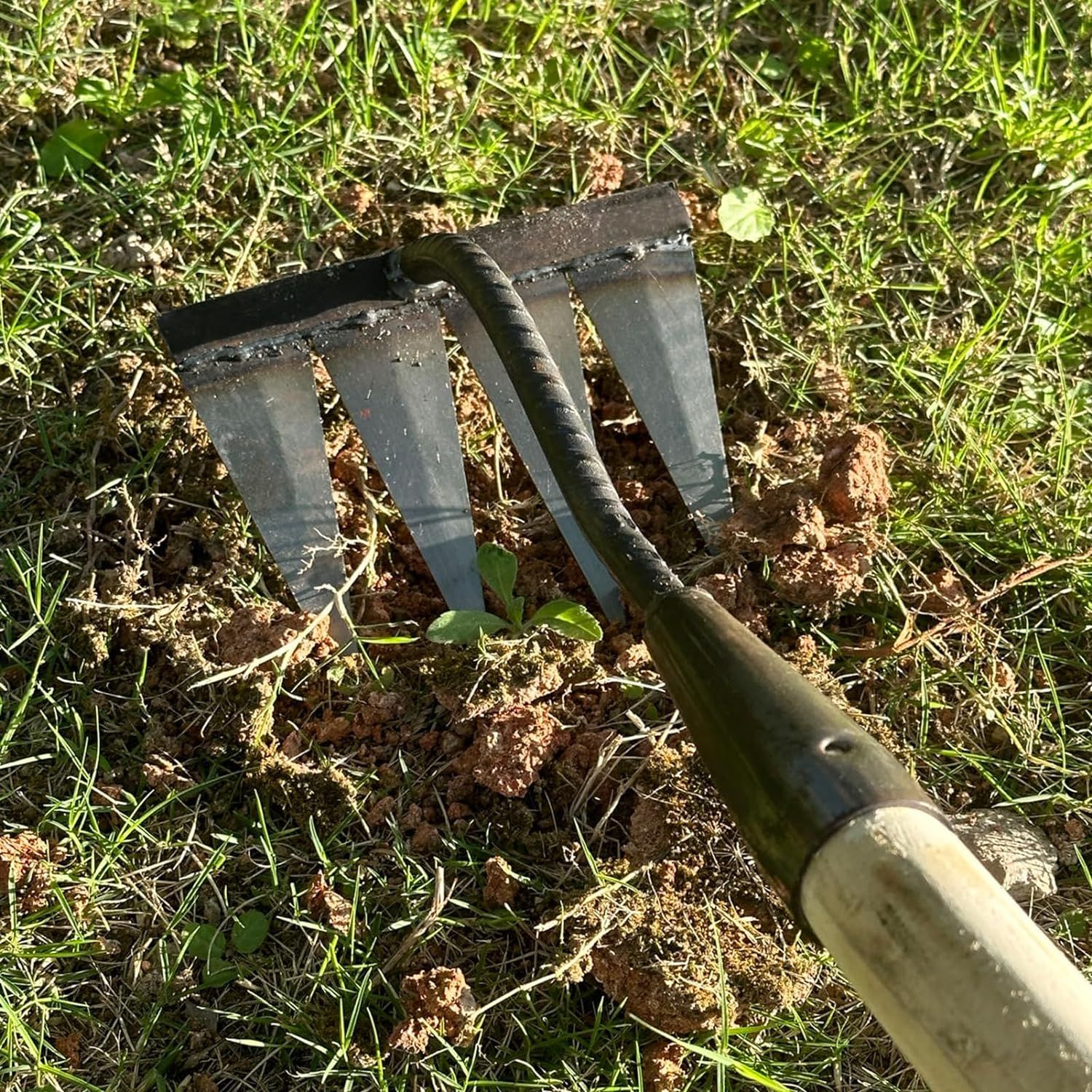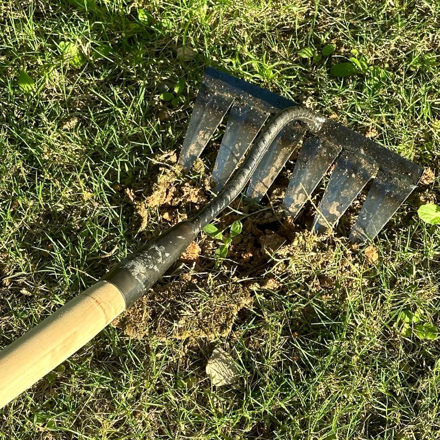 - High Quality Material: The garden rake is made of high-quality carbon steel, durable, not easy to break, the tines has a good sharpness, making your weeding work easier.