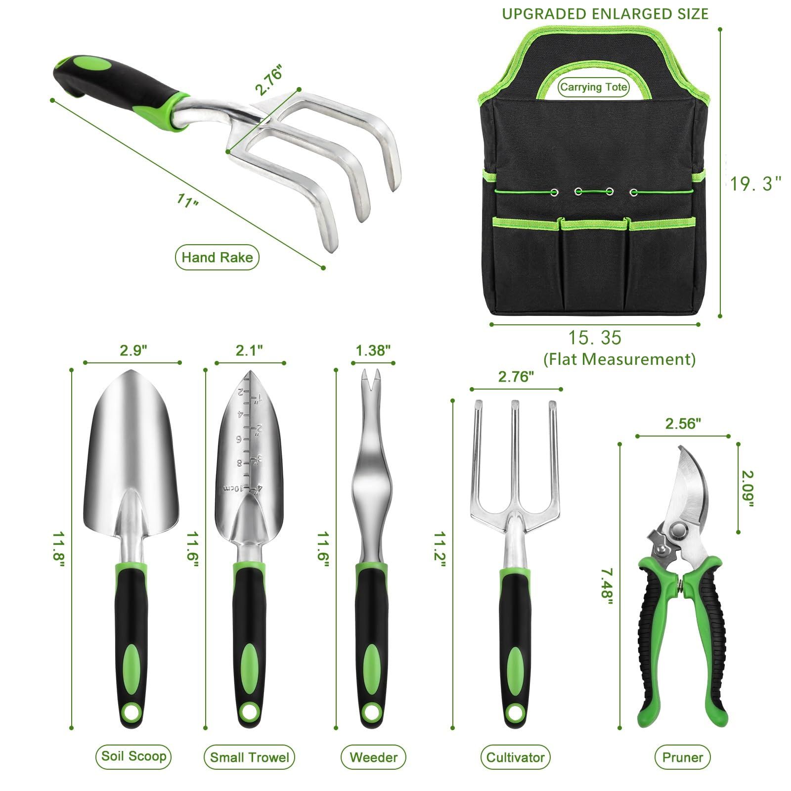 Upgrade your gardening game with AT1NTEN's 8-pack garden tool set. Say goodbye to cheap, unreliable tools and get everything you need for a perfect garden. The durable material allows you to work in any soil, even hard and gravelly ones, while the non-slip rubber grip ensures comfortable and secure handling for long periods of time. Don't settle for less - with the enlarger tote bag, 15.35*19.3 inch make store a breeze.